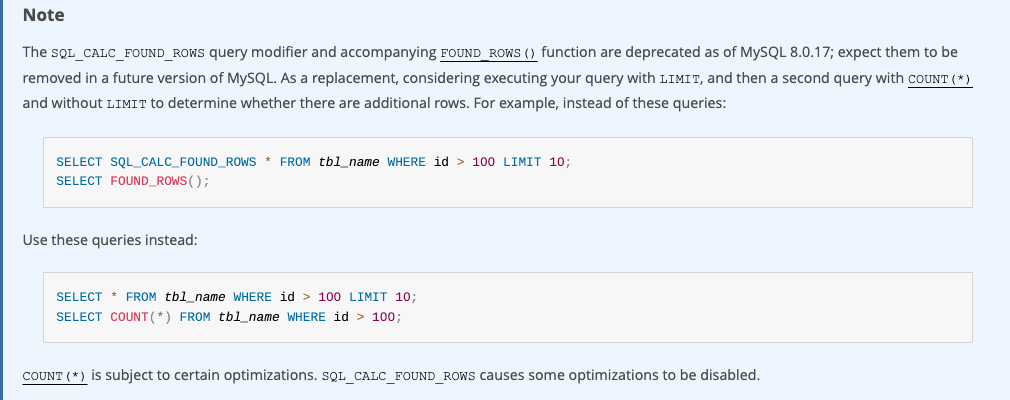 그래서 쿼리 성능을 개선할 시간이 없거나 할 여견이 되지 않는다면, FOUND_ROWS() 를 사용하는 것도 고려해보자