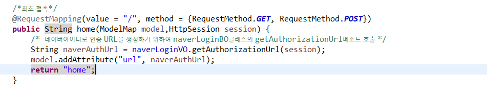 naverAuthUrl이라는 변수를 선언해서 naverLoginVO에 있는 URL 생성 메소드를 호출했다.