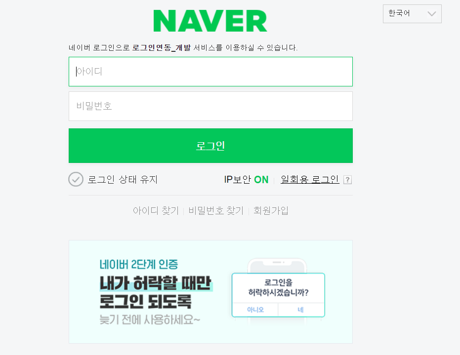 해당 URL로 이동하게 되면 [로그인연동_개발] 이라는 내 애플리케이션 명칭이 조회되고,