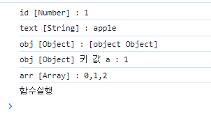 숫자형 문자형은 물론이고, 객체 키 값을 통한 값 접근, 부모 함수인 func 함수의 실행결과까지 모두 로그가 남아있다.