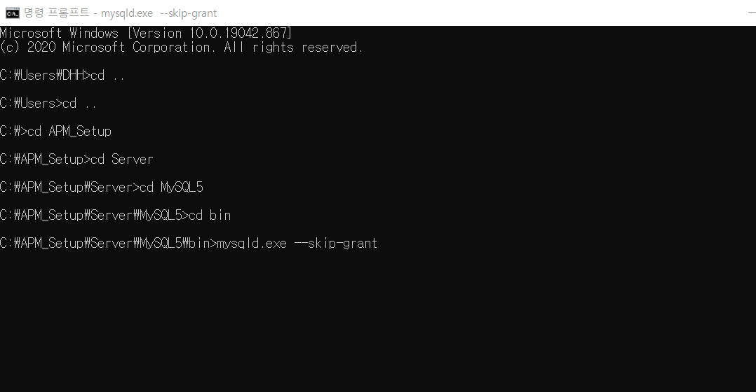 해당 경로에서 [mysqld.exe --skip-grant] 를 입력해준다