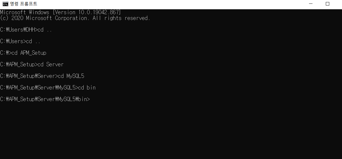 명령 프롬프트에서 mysqld.exe 실행파일이 있는 경로로 들어간다.