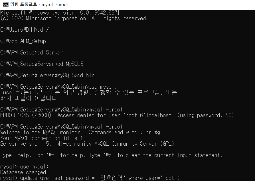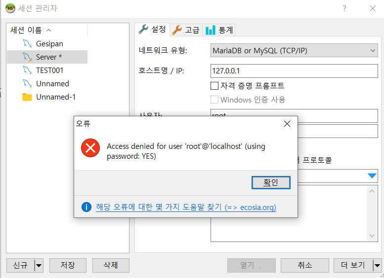 해당 오류는 거의 대부분 root 계정의 비밀번호를 잘못 입력했거나 비밀번호를 까먹었을 때