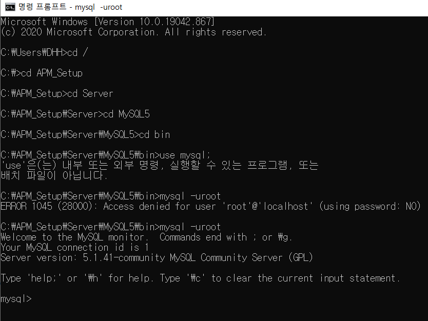 이 전에 동일한 경로로 입장하여 [mysql- -uroot] 명령어를 입력해준다