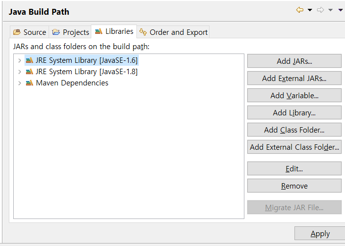 해당 경로로 이동하면 JRE SYSTEM Library 와 Maven Dependency가 있는데, 여기서 Add Library 버튼을 클릭한다.