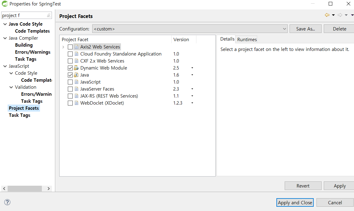 적용을 하고나서 다시 property 에 들어가서 Project Facets 를 검색한다