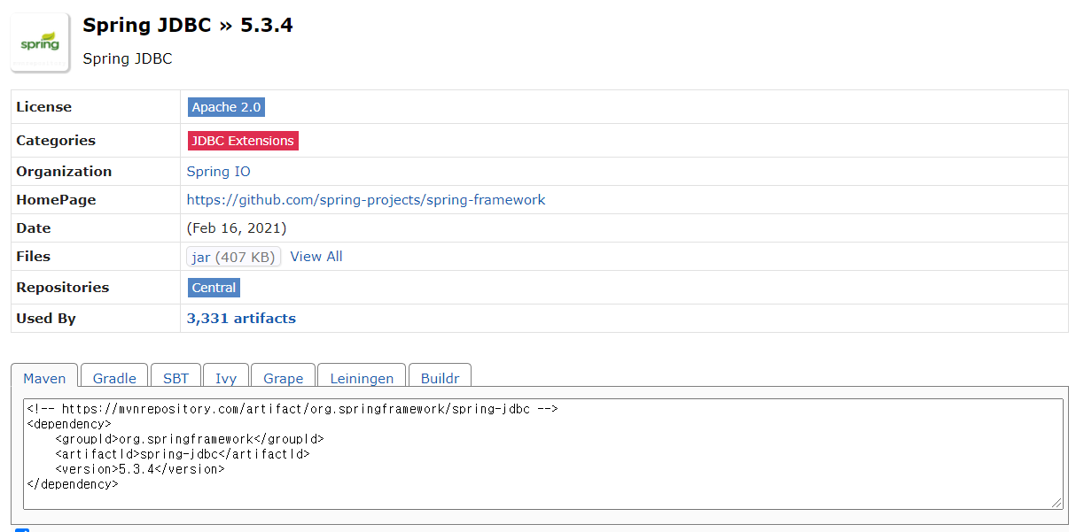 해당 dependency를 pom.xml의 <dependencies> 태그 안에 붙여넣기만 하면 프레임워크 환경에 해당 기술을 사용할 수 있다.