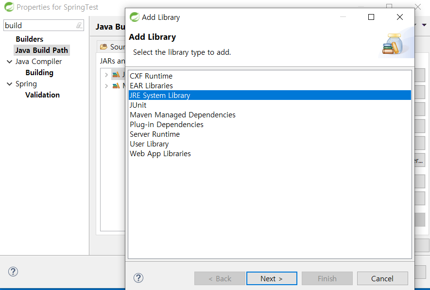 각각 수정해준 후, 프로젝트 우클릭 -> properties -> java buildPath 를 입력한다.