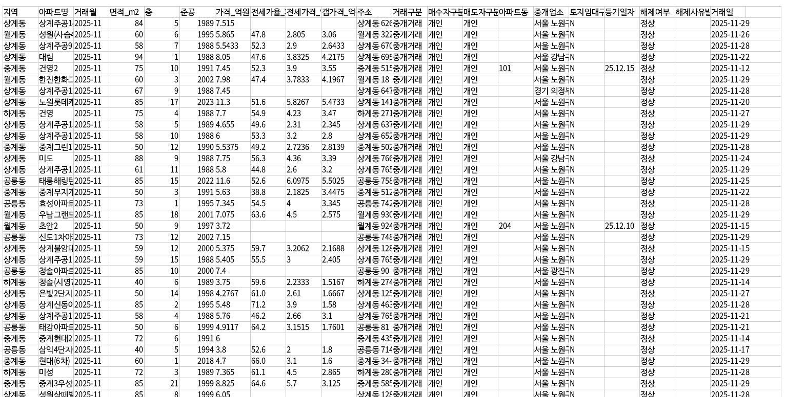 - 상세 정보 포함: 지역, 아파트명, 거래월, 면적, 층수, 준공년 등 모든 정보 포함