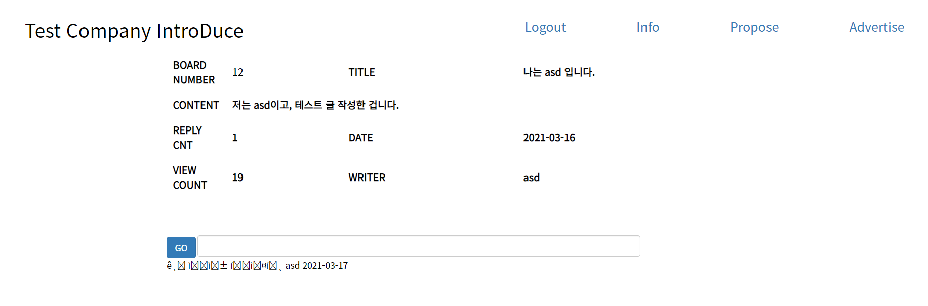 분명 글작성 테스트라고 입력을 했는데, 하단에 출력한 글을 보면 한글이 모두 깨져 있다
