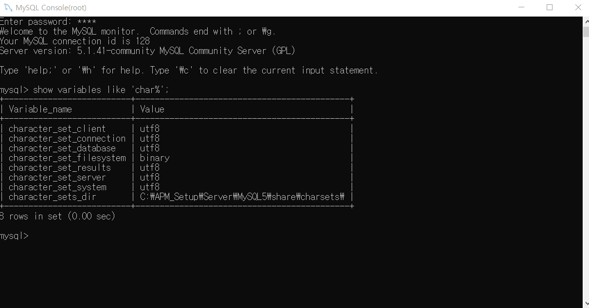 show variables like 'char%'; 를 입력해 해당 character set 설정을 확인한다