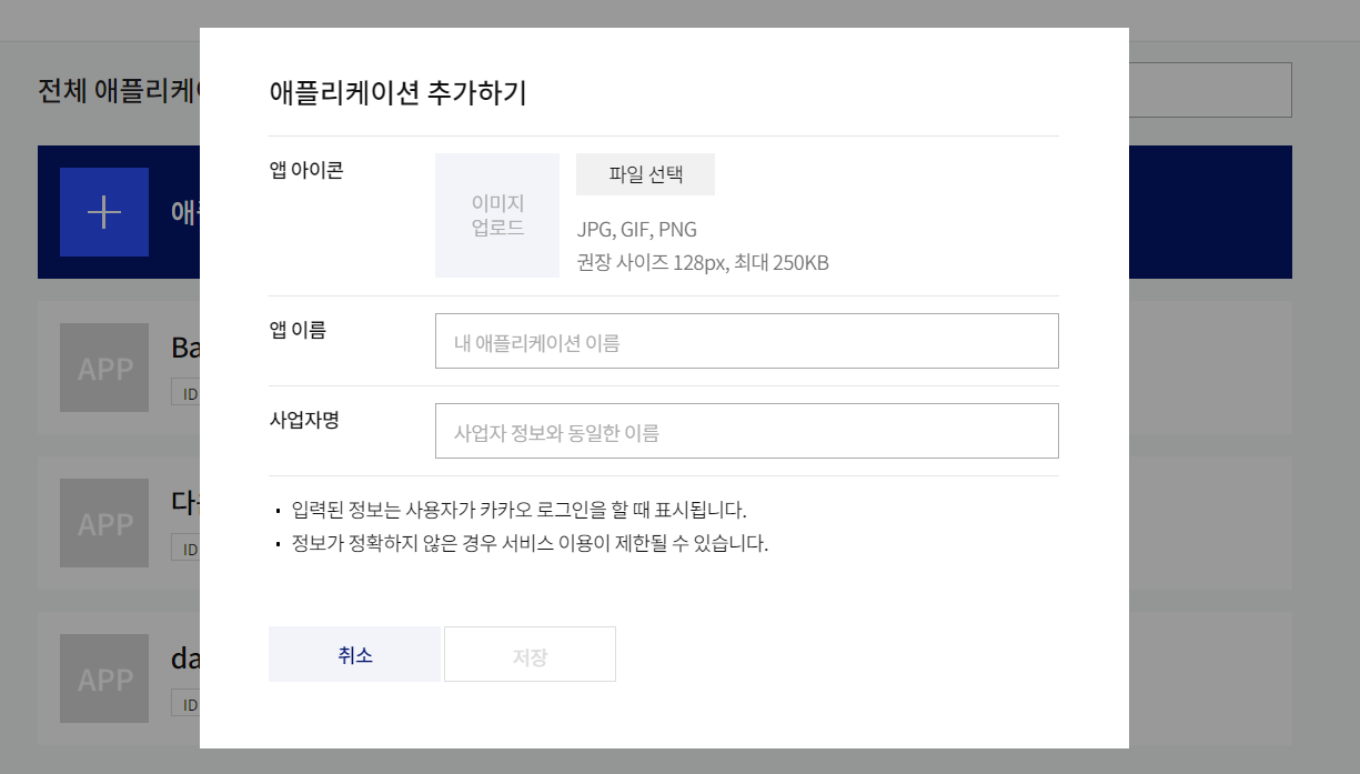 앱 이름과 사업자명은 테스트를 위한 작업이라면 내가 식별하기 쉽게 입력하도록 하자.