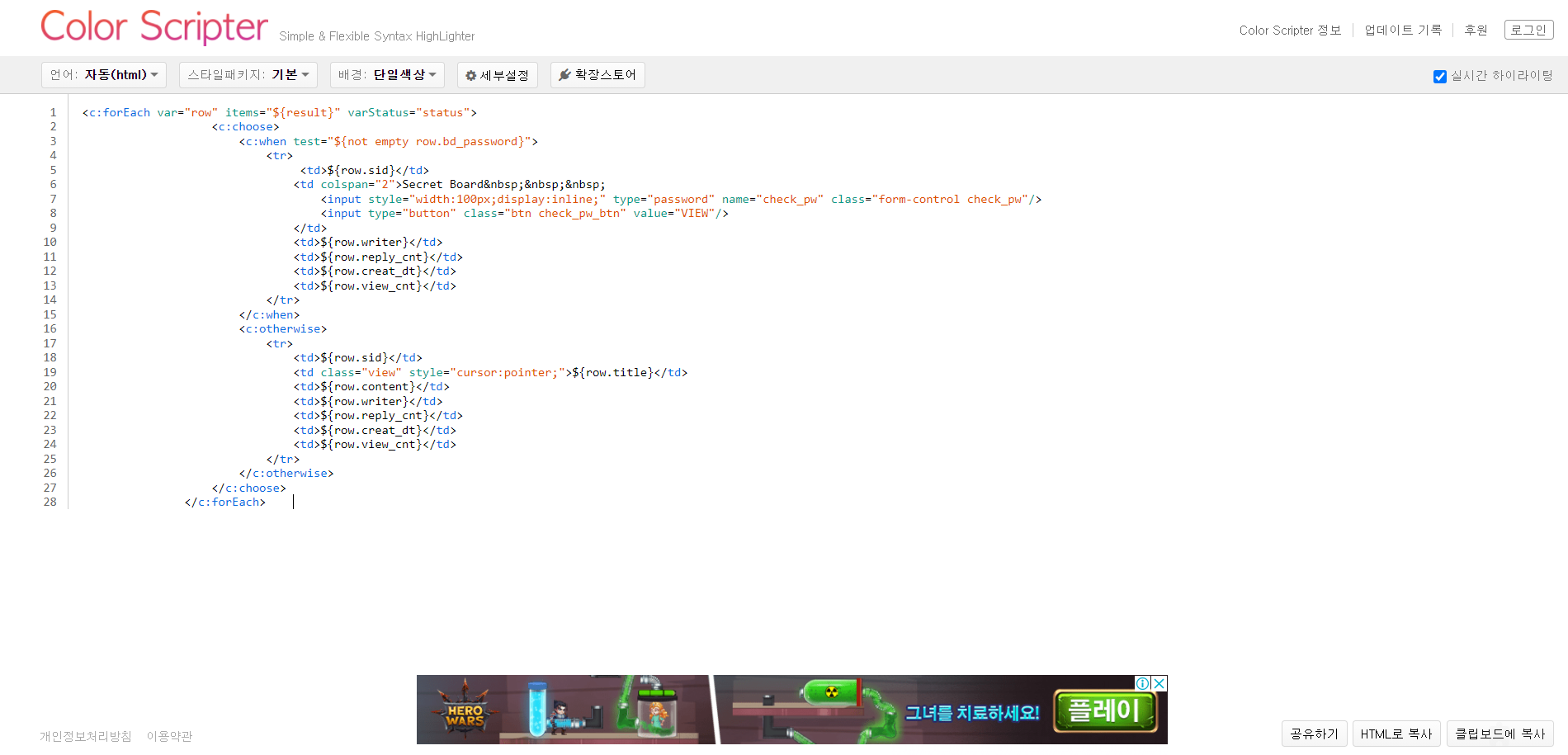 빨간 박스가 ColorScripter에서 제공한 html 코드를 붙여넣기 한 것이다.