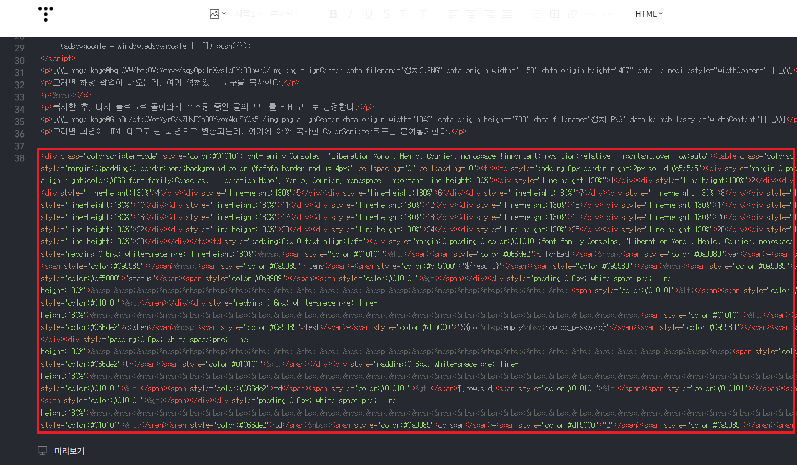 그러면 화면이 HTML 태그로 된 화면으로 변환되는데, 여기에 아까 복사한 ColorScripter코드를 붙여넣기한다.