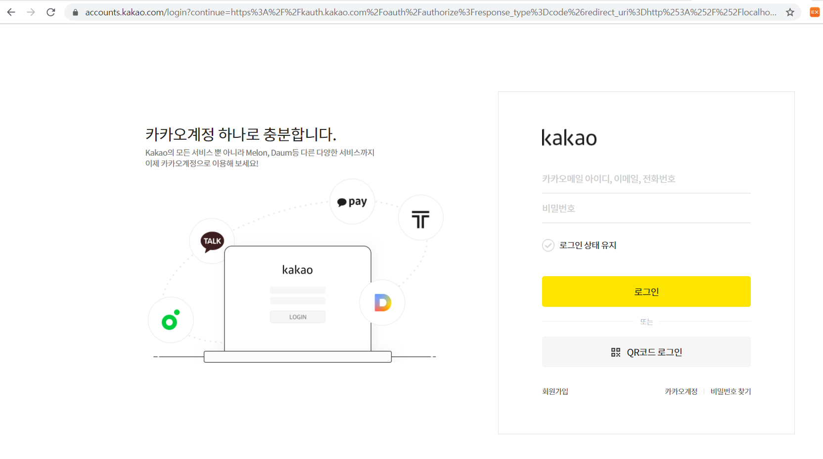 이부분만 입력시켜주면, 카카오 웹페이지 중 로그인 페이지로 리다이렉트 시켜준다.