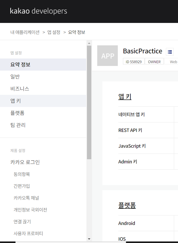 플랫폼 설정까지 마치고 나서, 애플리케이션을 클릭해보면 해당 애플리케이션 정보가 나온다.