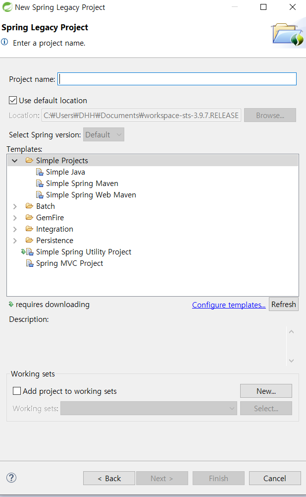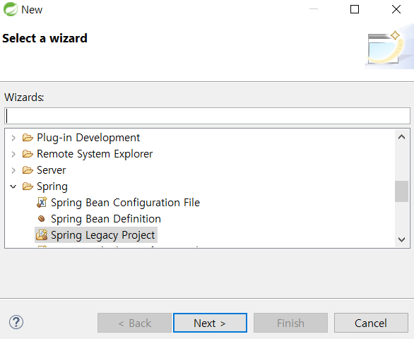 여기에 드래그 되어있는, Spring Legacy Project를 클릭한다.