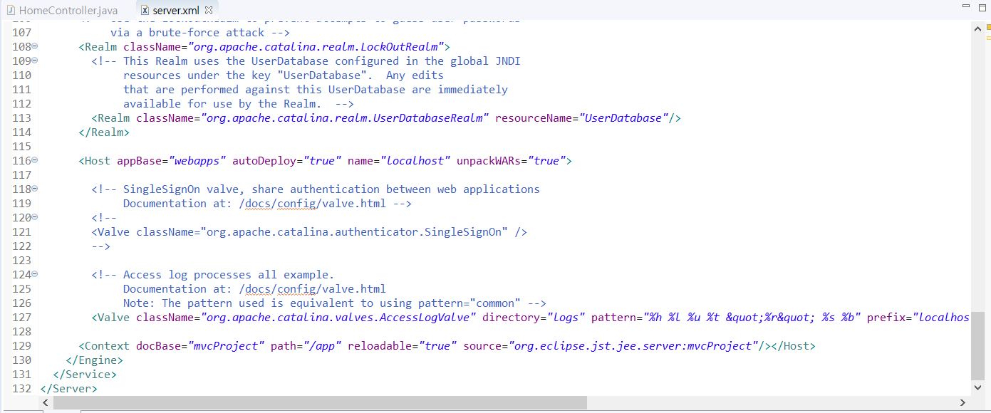 폴더 내부에 server.xml 파일을 열어 보면, 톰캣에 올라가 있는 MVC 프로젝트를 호출할 때, 호출 URL을 설정하는 부분을 볼 수 있다.