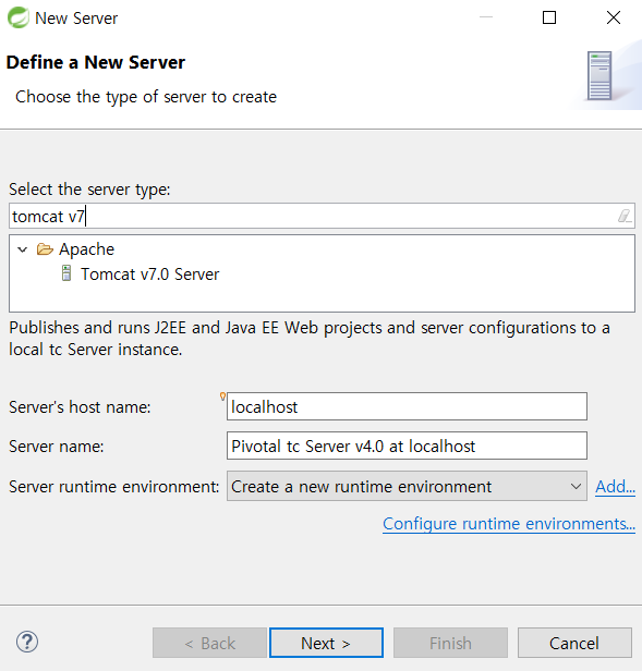 Next 클릭 후, Browse... 버튼을 클릭해서 설치한 톰캣 경로를 지정해준다.