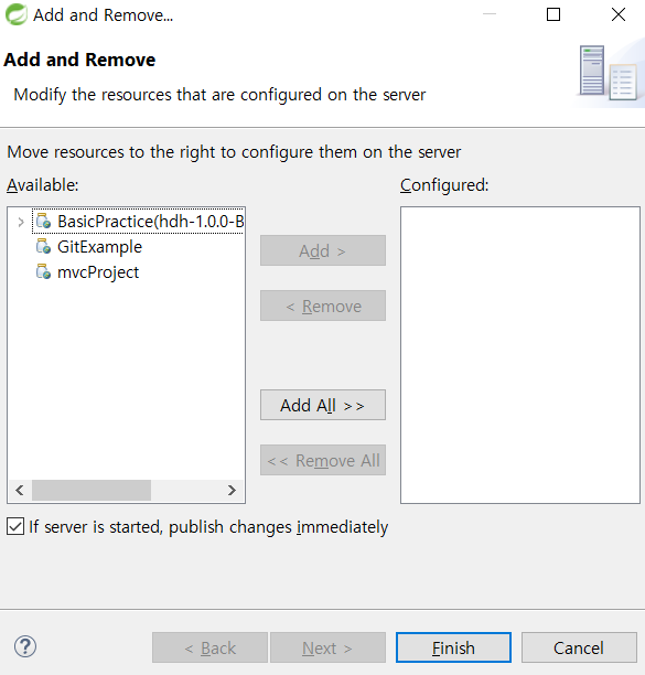 여기서, 우리가 생성한 mvcProject를 오른쪽 Configured 탭으로 옮겨 준 후, Finish를 눌러준다.