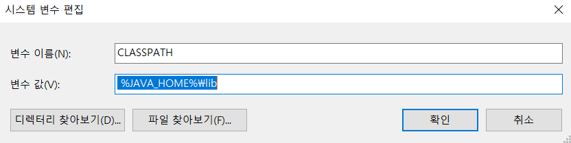 5. 마지막으로, JAVA_HOME 변수를 만들 때 처럼, 하단의 새로만들기 버튼을 클릭하고, CLASSPATH 변수를 아래와 같이 등록해준다.